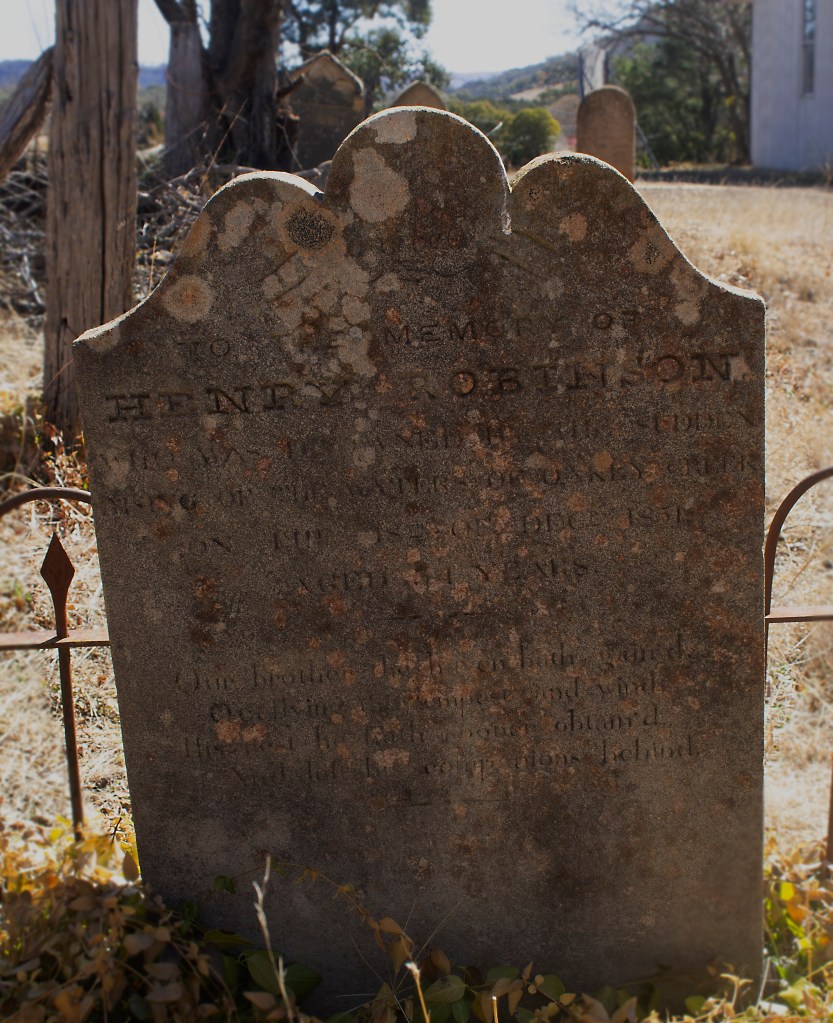 The grave’s occupant, Henry Robinson, was lost to the waters of nearby Oaky Creek, just as the stone itself is now being lost to the elements.