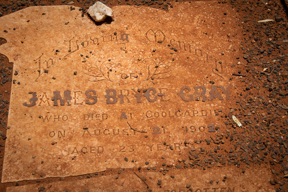 James Gray’s cracked headstone (above) lies partially obscured by red dirt at the Coolgardie cemetery, Western Australia.