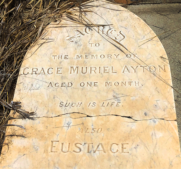 The stone is stark, and simply says Sacred to the memory of Grace Muriel Ayton one month, such is life. She is buried with Eustace Ayton, but no other people of that family name are in the cemetery.